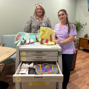 The new hospital trolley ‘DELIA’ (Distraction Engagement Lots of Interactive Aids) is overflowing with resources for care teams and carers to support patients. Filled with activities like puzzles and crocheted sensory mats, handmade by our wonderful Monash Health volunteers.